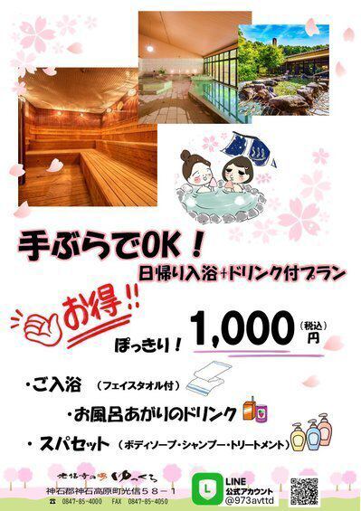 日帰り入浴+ドリンク付プラン♪